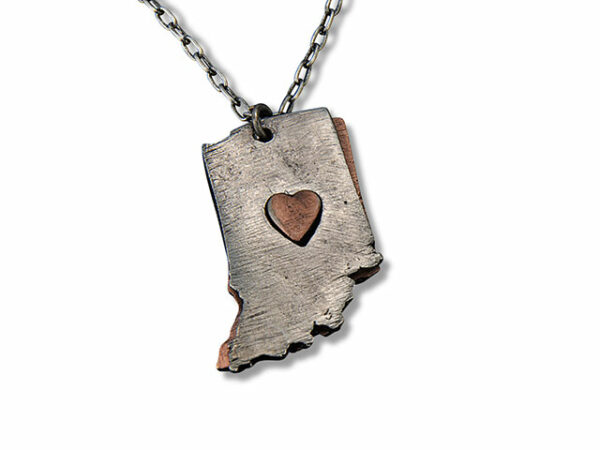 Indiana state necklace with rustic finish in pewter. 16″ chain with 2″ extension.