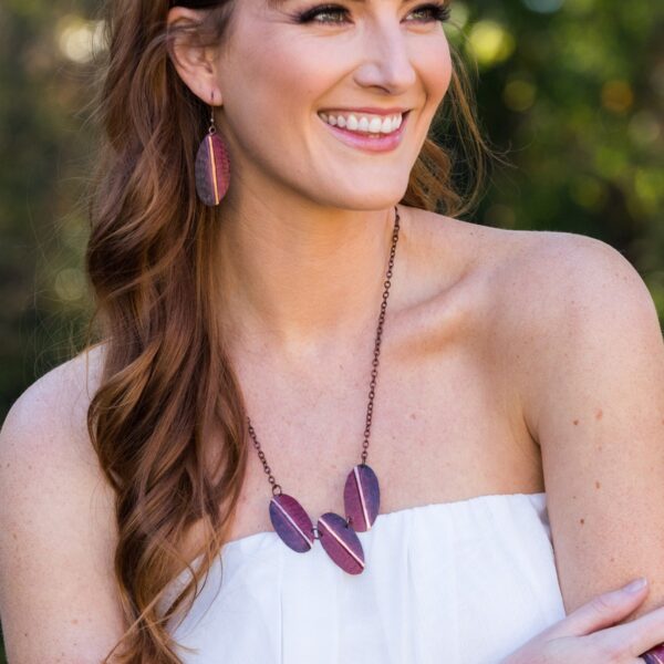 Brass Patina Necklace – Plum Purple Dots and Lines Ovals