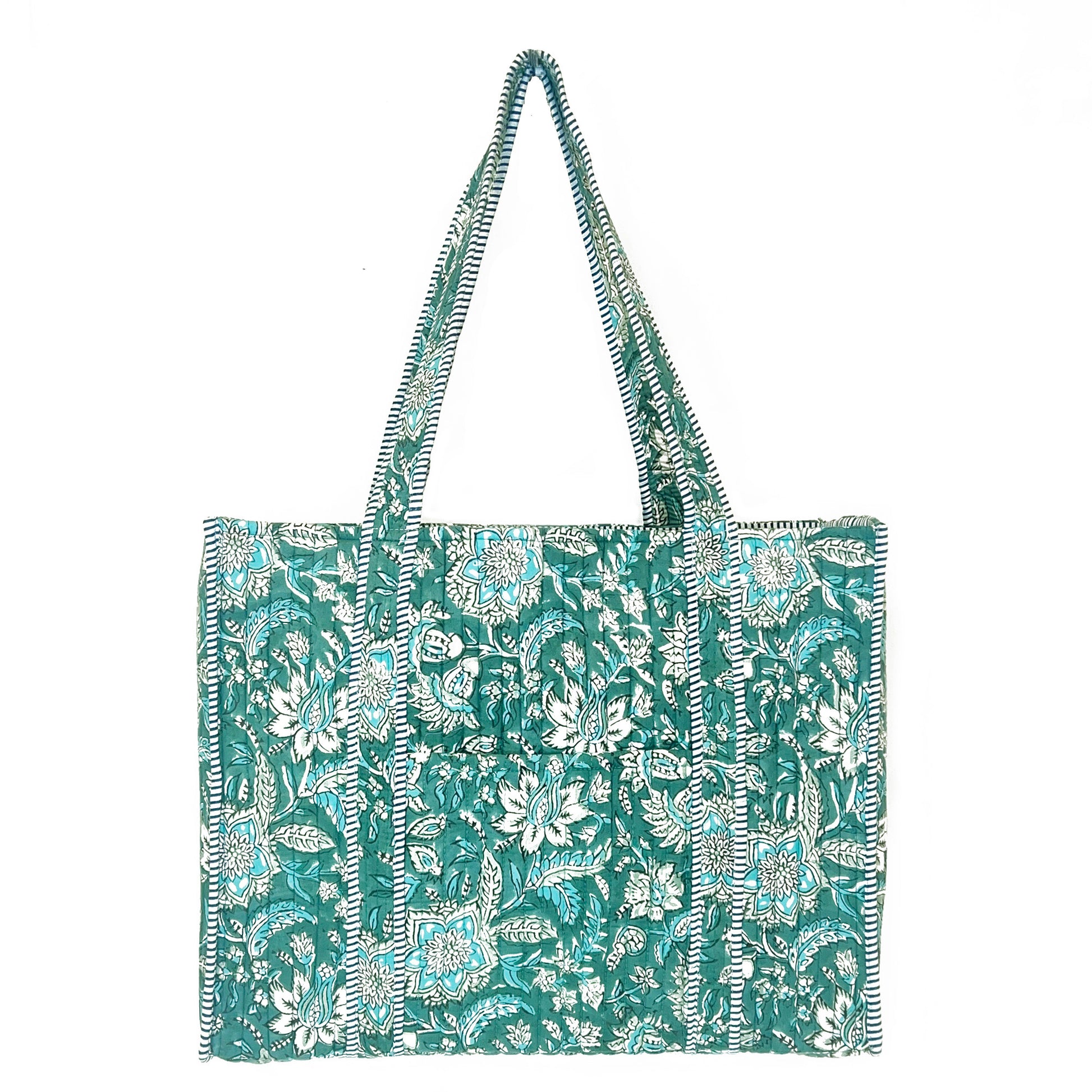 Introduce your customers to quilted bags.. Each bag features unique block-printed patterns lovingly handcrafted by skilled artisans. The intricate designs and vibrant colors make every piece one-of-a-kind, adding a touch of elegance and heritage to your style. Who doesn't love a little extra? Each bag has a built-in pocket inside, perfect for keeping your smaller items organized and within easy reach. By choosing our Quilted Block-Printed Bags, you support sustainable practices and the artisans dedicated to their craft. Feel good about your style and your impact on the world. 100% Cotton.