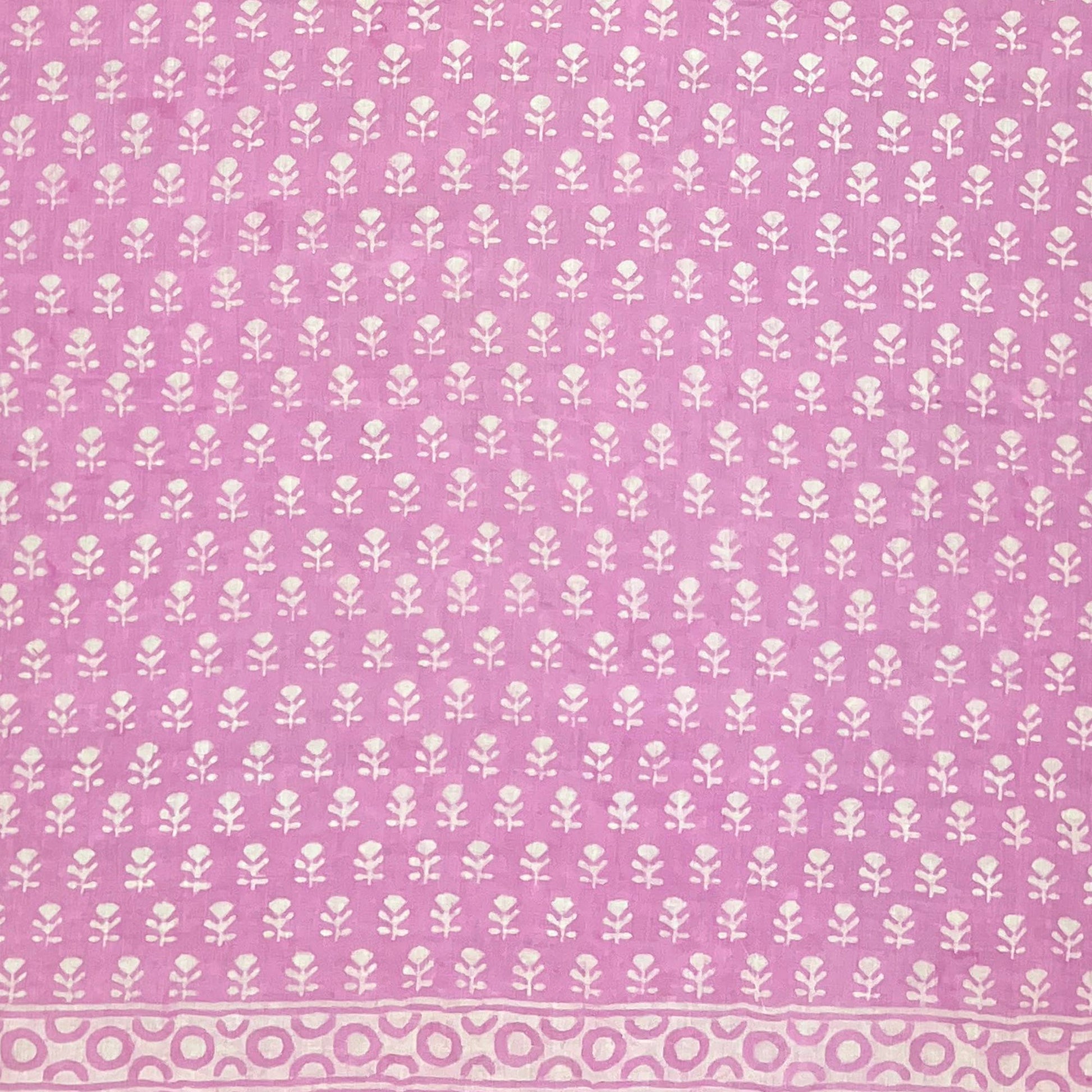 Our Handcrafted Cotton Sarong features a sweet block-printed design in Pink Floral Sprig. The pattern showcases small, repeating white flower sprigs on a soft lilac-pink background with a circle border. Lightweight and breathable.